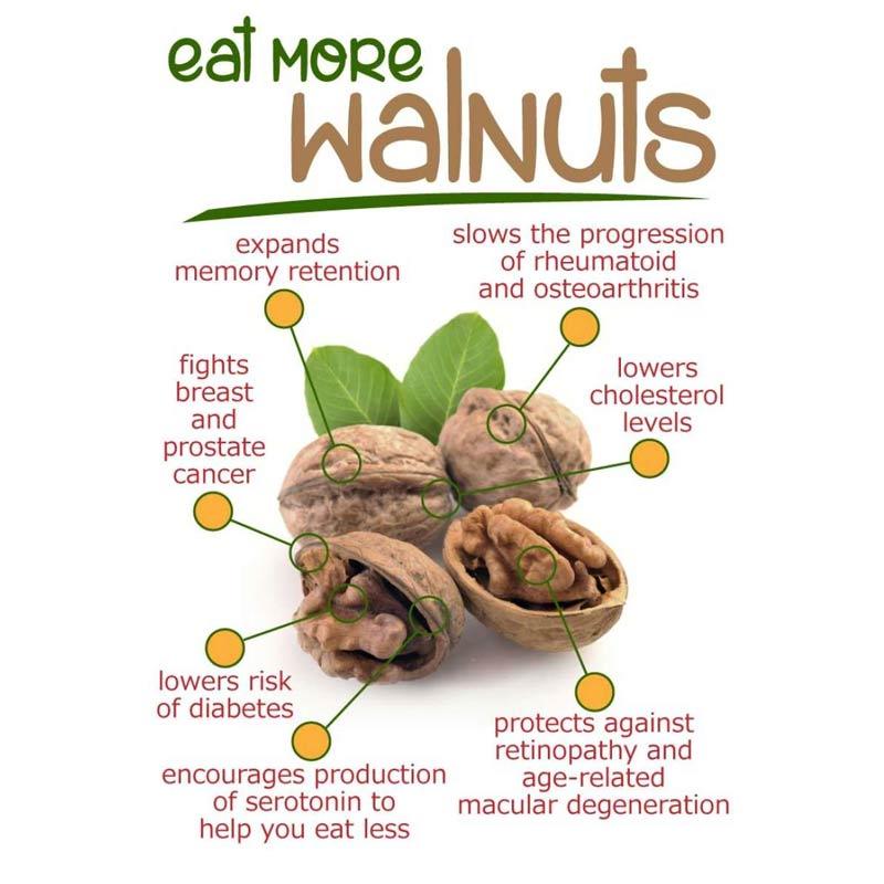 Studies suggest that including walnuts in your diet can improve cognition and prevent or slow the progression of some degenerative diseases. For example walnuts contain high amounts of omega-3 fatty acids. Known for their unique wrinkly brain-like appearance walnuts have a wide range of health benefits from boosting brain health to preventing heart disease to weight loss.
