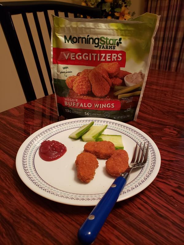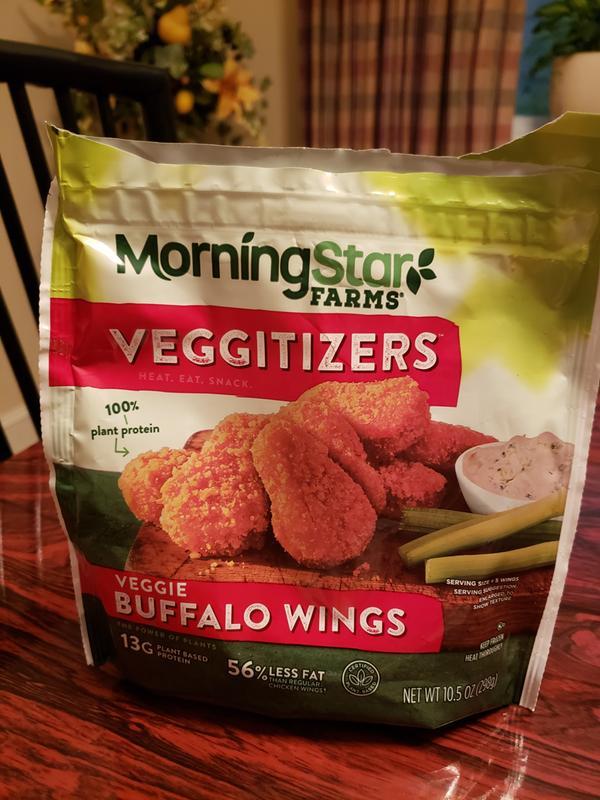 MorningStar Farms Buffalo Wings MorningStar Farms Veggie Buffalo Wings are a delicious vegan appetizer to share with friends served with creamy sauces or atop nachos. Cook MORNINGSTAR FARMS Buffalo Veggie Wings according to package directions. 21 of daily value and a good source of fiber.