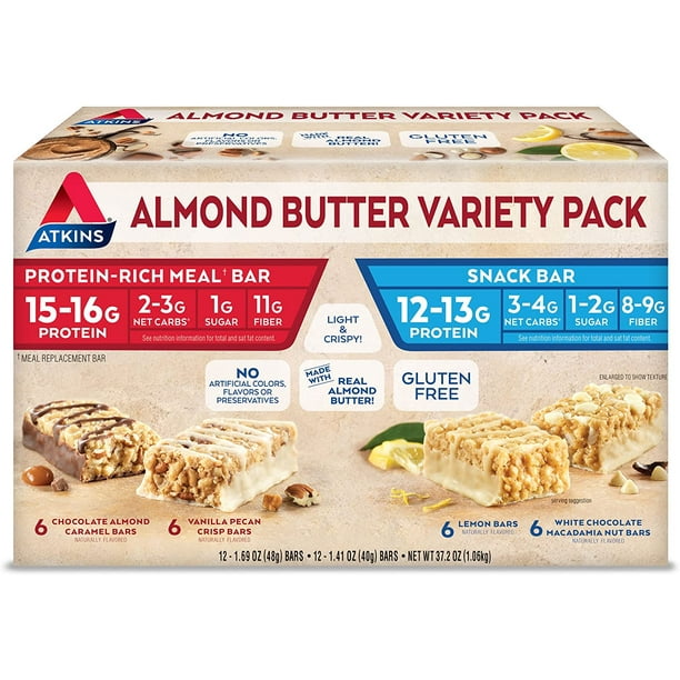 Atkins Almond Butter Meal And Snack Bar Variety Pack Gluten Free Light And Crispy Protein Fiber Bars Made With Real Almond Butter 4 Flavors 24 Bars Walmart Com Walmart Com